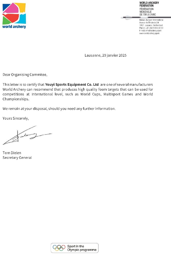 目前,主要生產(chǎn)和銷售射箭比賽及訓(xùn)練專用器材,包括:箭靶、靶紙、靶架、號碼牌、風(fēng)向旗、計時記分器等場地器材設(shè)備;反曲弓、復(fù)合弓、傳統(tǒng)弓、瞄準(zhǔn)器、防震桿等弓箭裝備;箭壺、護胸、護臂、護指等各類箱包護具。公司所生產(chǎn)的射箭器材已通過國際射箭聯(lián)合會及中國射箭協(xié)會CAA認(rèn)證。